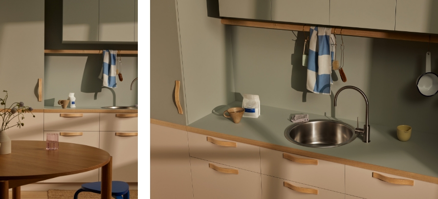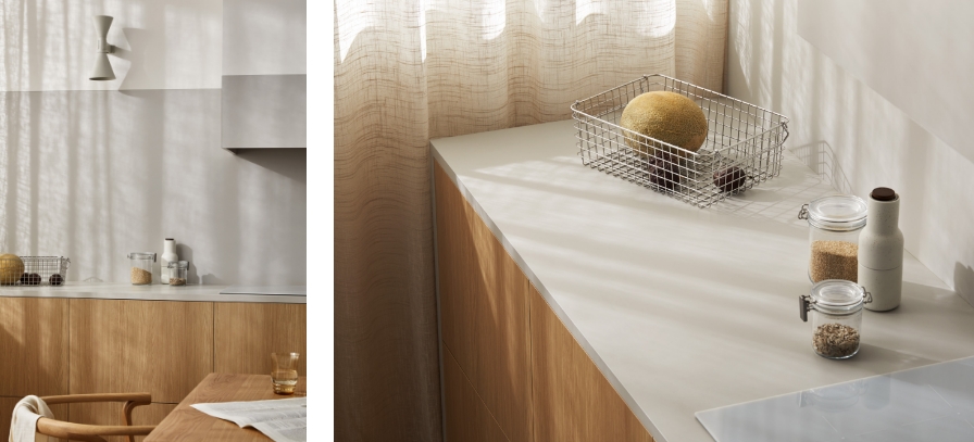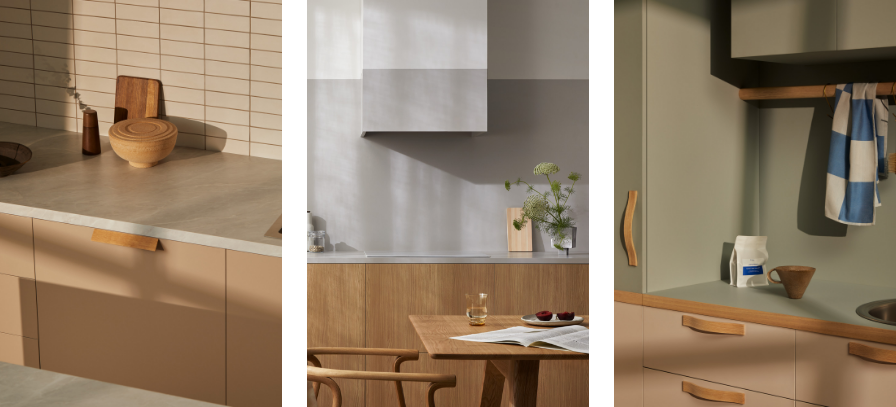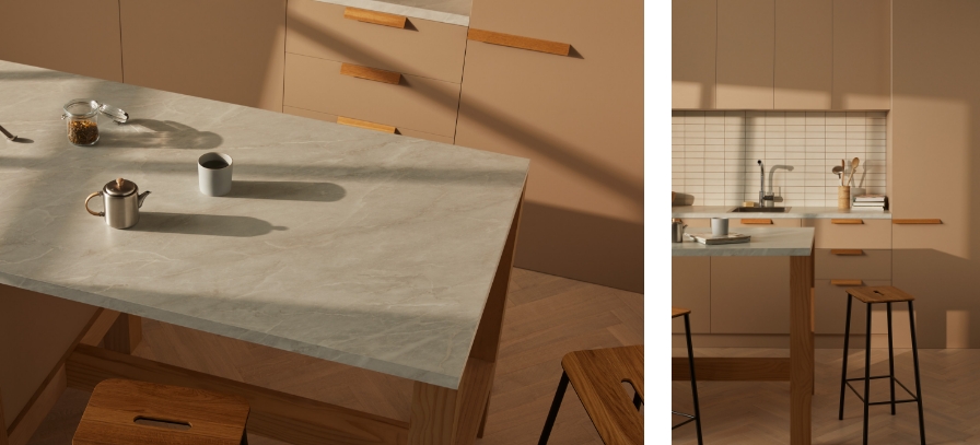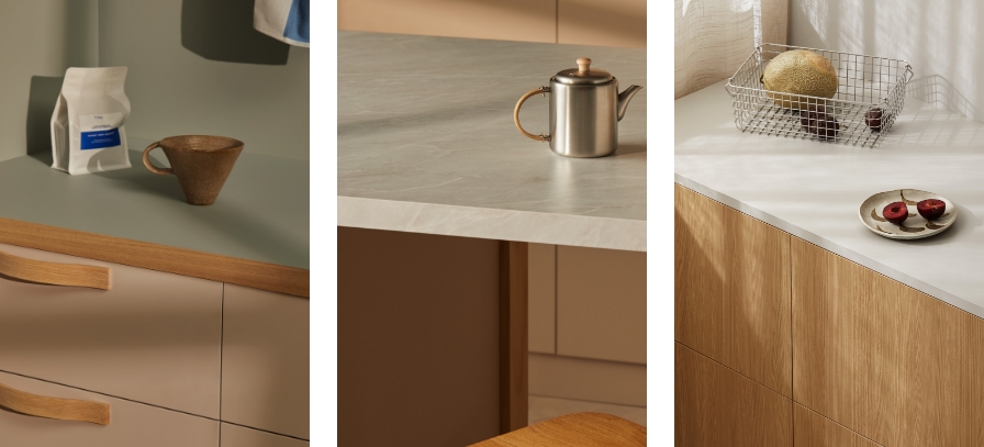 Laminex Lux Elba TrueScale (Digital Edging ABS Edging) benchtop and Peruvian Clay joinery. Laminex Oyster Grey (InvisiEdge ABS Edging) benchtop and Aged Ash joinery. Laminex Spinifex AbsoluteMatte benchtop and joinery with timber edge and Aires in AbsoluteMatte joinery.